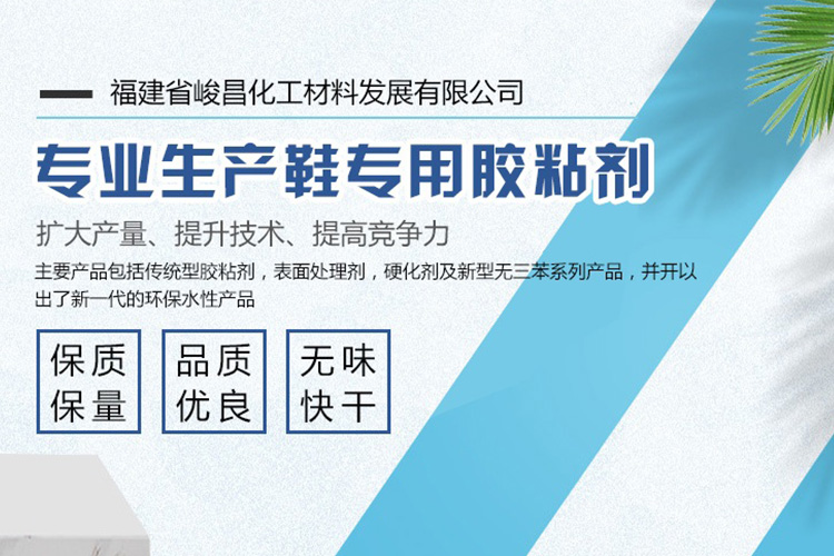 福建省峻昌化工材料發(fā)展有限公司總部設在中國鞋鄉(xiāng)——晉江。為更好、更方便服務廣大客戶,我司在廣東江門及福建均設有先進的PU膠生產(chǎn)基地,歡迎廣大同行前來我司灌裝或批發(fā)銷售。公司是一家中外合資,面向亞太地區(qū)從事研究,生產(chǎn)銷售鞋用粘膠10多年的專業(yè)公司。從國外引進生產(chǎn)能力為數(shù)萬噸的全套先進生產(chǎn),檢驗設備,與德國Bayer,日本DENKA及美國,西班牙等其它海外公司有著密切的原材料及技術合作。公司主要產(chǎn)品包括傳統(tǒng)型膠粘劑,表面處理劑,硬化劑及新型無三苯系列產(chǎn)品,并開以出了新一代的環(huán)保水性產(chǎn)品。供應國內外鞋業(yè),手提箱包及建筑工程單位使用。公司始終保持產(chǎn)品的良好品質及專業(yè)特性,并倍受廣大客戶好評。